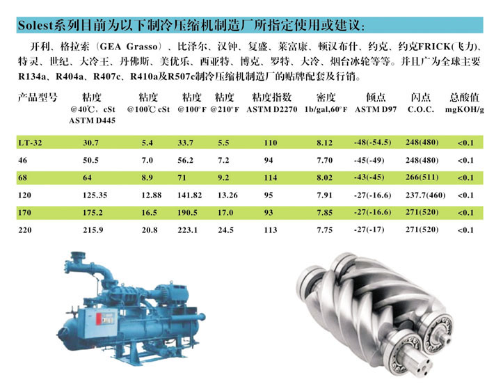 冰熊CPI-solest產品,是適用于 R134a、R404A、R407C、R410A、R507、R23、R508A、R508B等HFC型不破壞臭氧層的環保制冷劑的合成多元醇脂類冷凍機油 (POE),可供選擇的粘度指數范圍由 ISO VG5 至 VG 220。CPI公司不斷開發新的產品和提高產品質量,使之成為擁有XX廣泛壓縮機廠商認證的冷凍機油品牌。X已有超過四億臺壓縮機成功充裝 “Emkarate RL” 牌(即“冰熊”)冷凍機油。被世界制冷行業公認為制冷壓縮機潤滑油之XX佳選擇,已獲得世界各主要制冷壓縮機生產廠家認證。如: 谷輪 (Copeland) 、比澤爾 (Bitzer) 、丹佛斯 (Danfoss)/美優樂 (Maneurop) 、萊富康 (Refcomp) 、富士豪 (Frascold) 、泰康 (Tecumseh) 、都靈(Dorin) 、博克 (BOCK) 、開利 Carrier(Carlyle,Transicold) 、特靈 (TRANE) 、麥克維爾 (Mcquay) 、頓漢布什 (Dunham-Bush)、日立 (Hitachi ) 、漢鐘 (Hanbell) 、Sabroe 、格拉索 GEA(Grasso) 、GRAM 、SRM、羅特(Roltec)、神鋼(Kobelco)、Prestcold(谷輪附屬)、Blissfield(隸屬于泰康)、Frigopol、Hartford、Hispacold、羅爾斯(Royce)、大冷王(Thermoking) 、海運貨柜箱(Sea Containers) 、美國軍隊(USA Military) 、VATANU-COOL 、ROTARY VANE 等等。